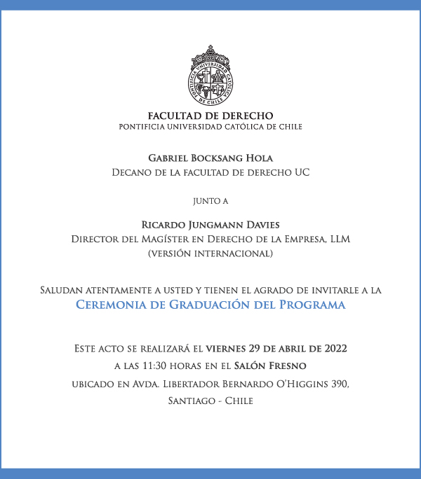 - Ceremonia de Graduación del Programa de Magíster en Derecho de la Empresa, LLM UC (versión internacional)