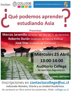 El próximo miércoles 25 de abril a las 13.00 se realizará en el Auditorio de College (campus San Joaquín) la charla ¿Qué podemos aprender estudiando Asia?, organizada por el nuevo Centro de Estudios Asiáticos UC (CEA UC) y el programa de College de nuestra Universidad.