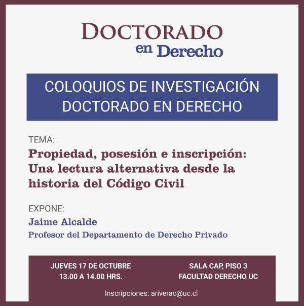 - Coloquios de Investigación Doctorado en Derecho: Propiedad, posesión e inscripción. Una lectura alternativa desde la historia del Código Civil