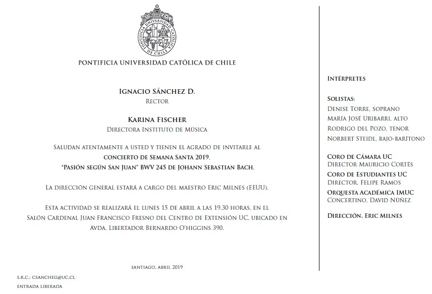 - Concierto de Semana Santa 2019: “Pasión según San Juan” BWV 245 de Johann Sebastian Bach