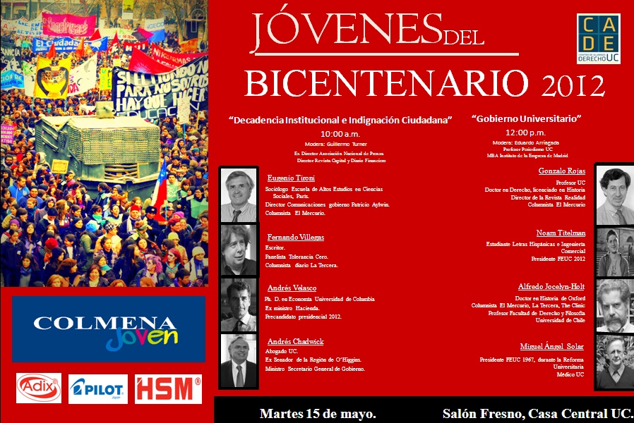 Como todos los años la Facultad de Derecho de la Pontificia Universidad Católica de Chile, a través de su Centro de Alumnos, CADe, organiza el Foro Jóvenes del Bicentenario, el cual tiene por objetivo crear un espacio de discusión en el que se fomenta el pensamiento crítico y el desarrollo vocacional de los alumnos, con la mirada puesta en el futuro de nuestro país.