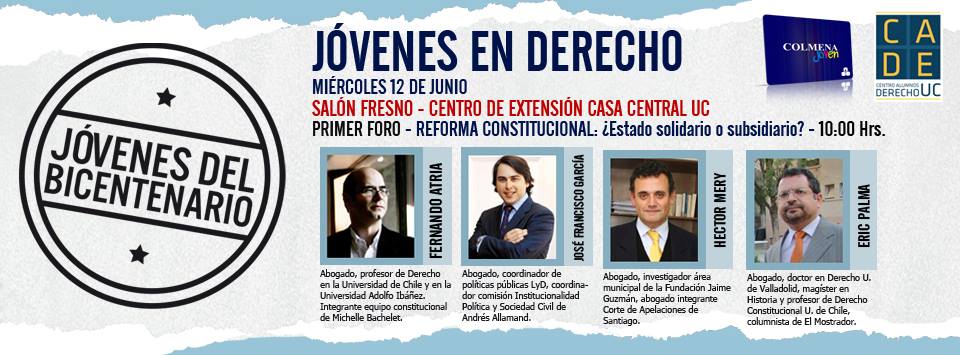 El miércoles 12 de junio se realizarán dos foros en el marco de los debates Jóvenes en el Bicentenario, actividades organizadas por el Centro de Alumnos de Derecho UC junto a sus símiles de las facultades de Ingeniería, Administración y Economía. En esta oportunidad se realizarán dos foros a partir de las 10:00 hrs. en el Centro de Extensón del Campus Casa Central.