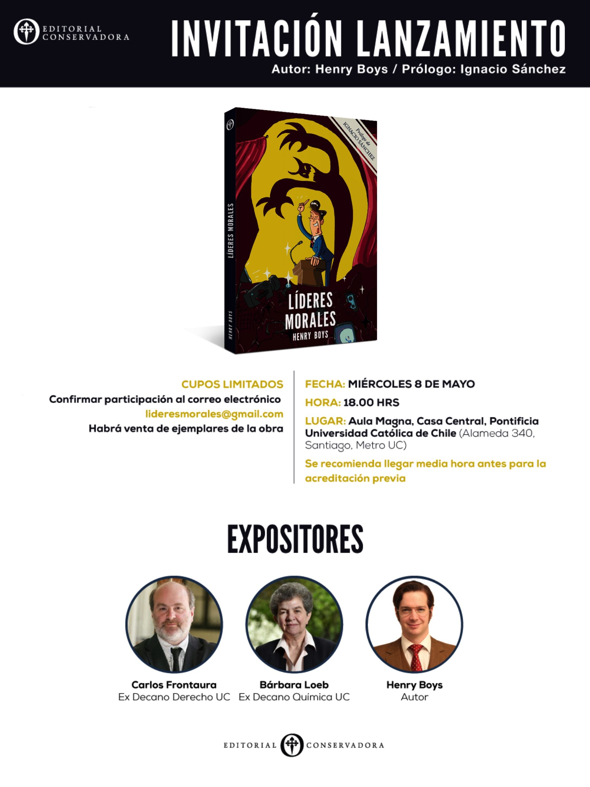 Inscripción gratuita, cupos limitados. Considera acceso al evento de lanzamiento y al cocktail posterior. Reserva tu cupo escribiendo al mail lideresmorales@gmail.com
