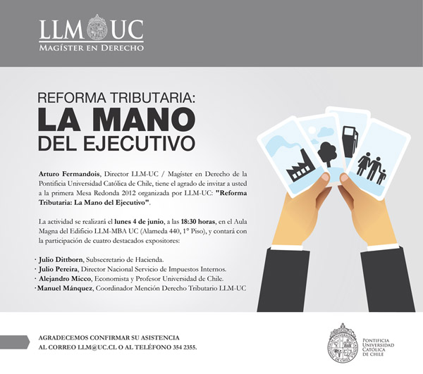 Arturo Fermandois, Director LLM-UC / Magíster en Derecho de la Pontificia Universidad Católica de Chile, tiene el agrado de invitar a usted a la primera Mesa Redonda 2012 organizada por LLM-UC: “Reforma Tributaria: La Mano del Ejecutivo”.