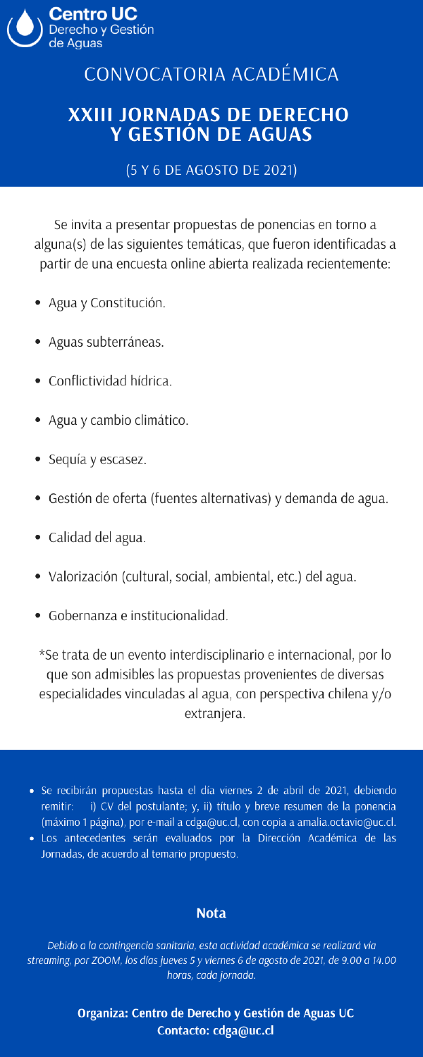 Plazo Convocatoria Académica: XXIII Jornadas de Derecho y Gestión de Aguas