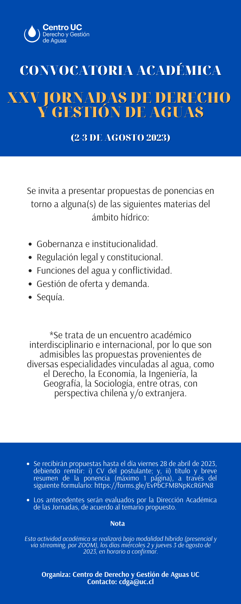 4. Plazo convocatoria académica: XXV Jornadas de derecho y gestión de aguas UC